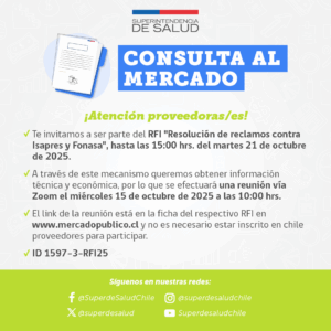 | Resolución de reclamos contra Isapres y Fonasa | Hasta las 15:00 hrs. del martes 21 de octubre tienes plazo para revisar y ofertar. ID 1597-3-RFI25 Reunión online informativa: día miércoles 15 de octubre de 2025 a partir de las 10.00. EL link de la reunión está en la ficha del RFI. Nota: no es necesario estar inscrito en chile proveedores para participar de este RFI |   |